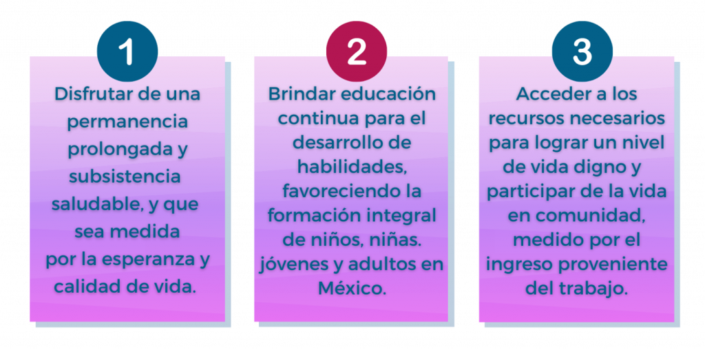 Crear capacidades de desarrollo de acuerdo al Programa de Naciones Unidas (PNUD), para mejorar el bienestar humano y apoyar los esfuerzos que reducen los índices de desigualdad en comunidades desatendidas principalmente, rurales, indígenas y peri-urbanas que presentan vulnerabilidad a la nutrición, a la alimentación, a la salud, a la educación y al desarrollo humano, principalmente en el Estado de México y Ciudad de México.